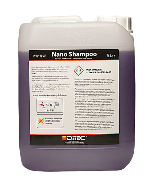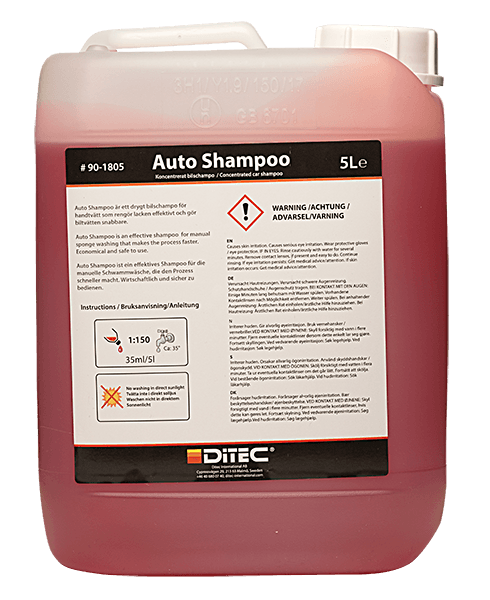 Hvorfor Skumvask? Forvasken er den viktigste forutsetningen for en skånsom bilvask. Målet er å bli kvitt alt av løse partikler før du vasker med berøring. Om bilen er sterkt tilsmusset (f. eks. asfaltrester), må du bruke avfetting først, men vasker du hyppig, kommer du gjennom store deler av året veldig langt med bare skumvask som forvask. Skum kan legges med lavtrykksprøyte, og kan spyles av med vanlig hageslange. Det er uansett mye bedre enn bare å spyle med vann før svampvask - da er du nemlig garantert å få de typiske vaskeripene i lakken. Best resultat får du ved å bruke skumkanon, og spyle av med høytrykk. Du skal spyle nedenfra og opp. Da får du nemlig mest mulig hjelp av kjemien når du jobber med høytrykkstrålen. Skal du vaske grundig, for eksempel før polering? Da bør du lese hvordan Ditecs profesjonelle vaskere jobber før de legger lakkbeskyttelse. Det er en prosedyre i sju trinn, der Skumvask blir brukt hele tre ganger. Bruksområde Ditec Skumvask er et for- og mellomvaskprodukt til den regelmessige bilvasken. Det er alkalisk, og fjerner effektivt støv og forurensing. Ditec Skumvask kan brukes på hele bilen, også motorvask. Ved oljerester, saltlake og asfaltrester anbefaler vi at du bruker Ditec Kaldavfetting før du legger Skumvask. Ditec Skumvask kan legges rett på Ditec Kaldavfetting. Egenskaper Ditec Skumvask gir et tykt skum som henger god på vertikale paneler (viktig for at kjemien skal få jobbe), og er skånsom mot plast og gummi. Det er et allsidig produkt som kan brukes på hele bilen. Bruksanvisning Rist flasken Bland ut med vann Bruk lav- eller høytrykks skumkanon La det virke i 3-5 minutt Spyl av nedenfra og opp Vask aldri i direkte sollys. La aldri produktet tørke på overflaten Dosering Dosering: Blandes med vann 1-5 % avhengig av graden av tilsmussing. Vær oppmerksom på at det er blandingsforholdet på lakken som gjelder. Bruker du Skumvask i skumkanonen til høytrykkspyleren, må du derfor finne ut hvor mye vann skumkanonen blander inn. NB: Overdosering kan skade lakken på bilen. Emballasje Innhold: 5 liter