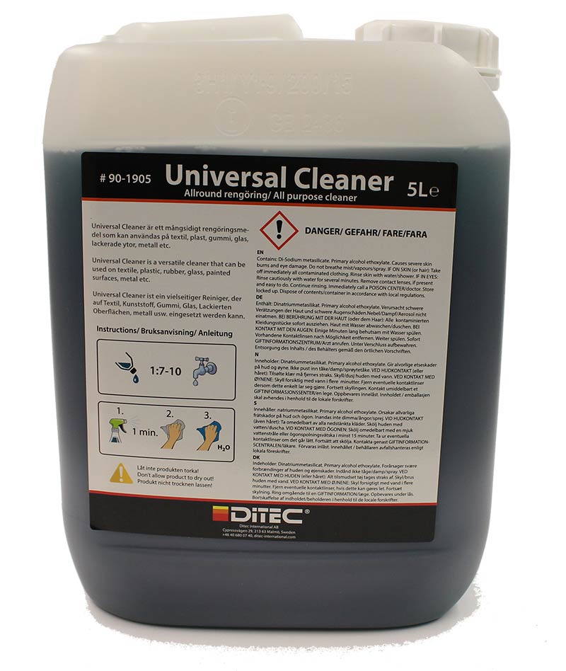 Ditec Universal Cleaner er en kraftig, men skånsom rengjøringsløsning designet for et bredt spekter av overflater. Med sin effektive formel fjerner den enkelt smuss, fett og olje, samtidig som den er trygg å bruke på både interiør og eksteriør. Ideell for bilpleie, men også anvendelig i hjemmet eller på arbeidsplassen. Denne rengjøreren etterlater en ren og frisk overflate uten å skade materialer som plast, vinyl, tekstil eller glass. Egenskaper: • Kraftig rengjøring: Fjerner effektivt vanskelige flekker som olje og fett. • Skånsom formel: Trygg for alle overflater, inkludert sensitive materialer. • Allsidig bruk: Egnet for både bil, hjem og arbeidsplass. Bruksanvisning: 1. Fortynn Universal Cleaner i henhold til behov (se emballasje for detaljer). 2. Påfør løsningen med en sprayflaske, klut, eller svamp. 3. La det virke i noen minutter på svært skitne områder. 4. Tørk av eller skyll med rent vann. 5. Tørk av med en ren klut for en stripefri finish.