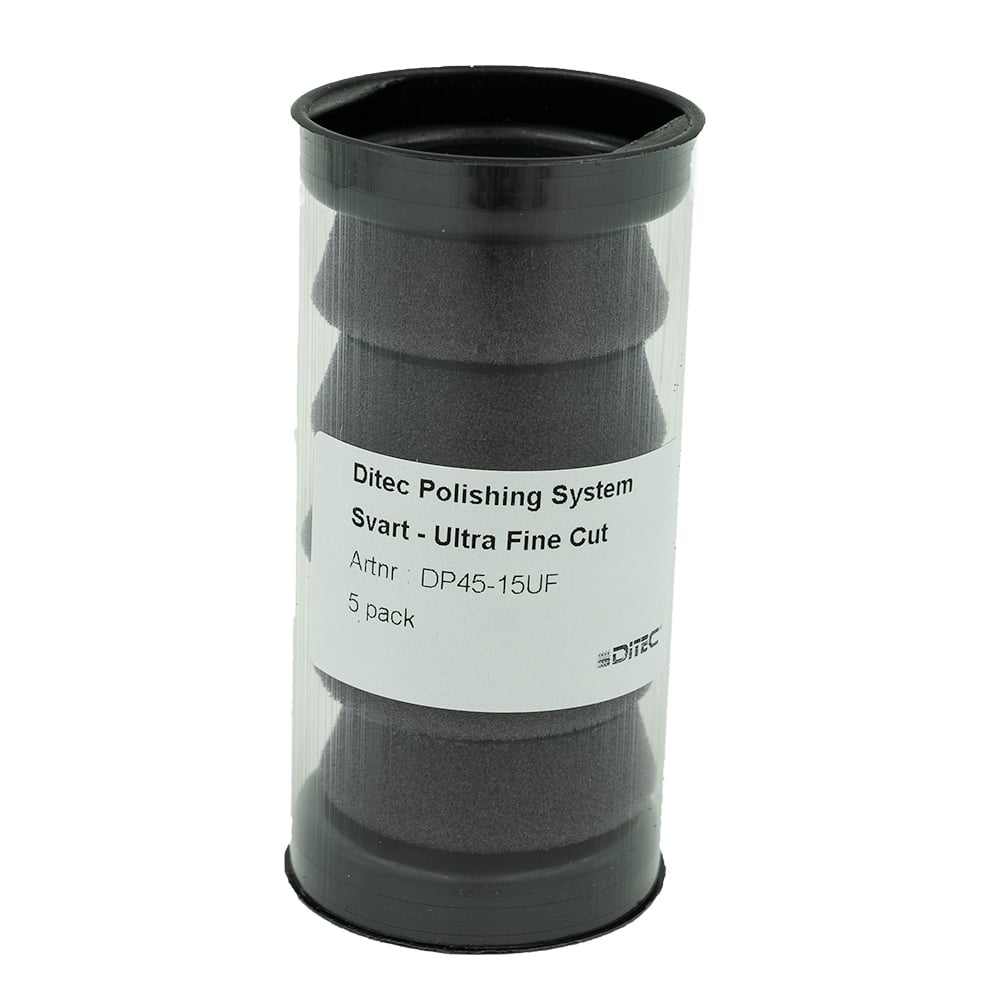 NY! Ditec skumpoleringsputer 2.0 Våre nye skumputer av førsteklasses kvalitet, testet og produsert for bruk med vårt utvalg av høyytelses poleringsprodukter. Den svarte puten er laget for minimal kutte/superhøyglanseffekt. Egnet for etterbehandling og hologramfjerning på alle moderne malingstyper og gelcoat. Spesielt egnet for mykere og mørkere malinger. For bruk med (DA) oscillerende maskiner. Konstruksjonen og kvaliteten på skummet som er valgt for produksjon, gir brukeren en pute som har lang levetid, god varmeavledning og bearbeidbarhet til poleringsproduktet. Anbefalt for bruk i kombinasjon med Ditec Hologram remover polish. Kan også brukes i andre kombinasjoner, som med vår Fine Cut. Rengjøres enkelt med trykkluft eller børste under poleringsprosessen, kan skylles etterpå eller rengjøres i en putevasker. Hold puten ren under prosessen for optimal finish.