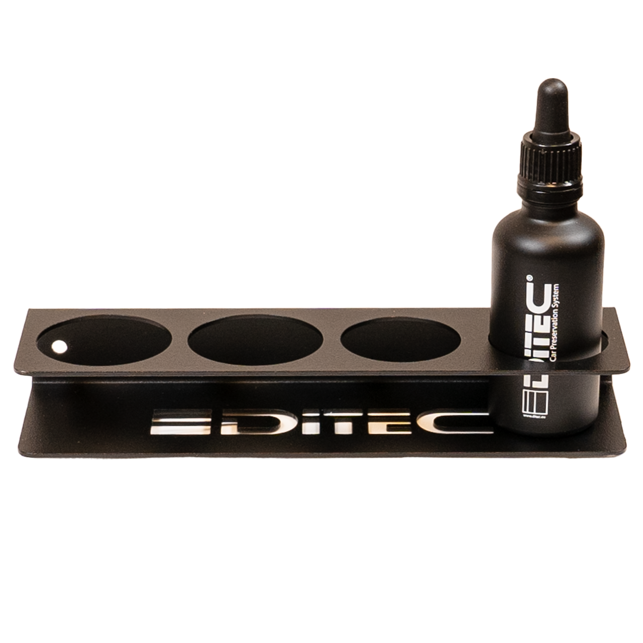 Four holes 45 mm will accommodate the majority of 30ml and 50ml bottles with coatings. The free-standing stand can be placed anywhere near your workstation or directly on your detailing trolley. Durable steel and powder finish guarantee perfect appearance and durability of the material. Length: 20 cm Width: 5,5 cm Height: 3 cm